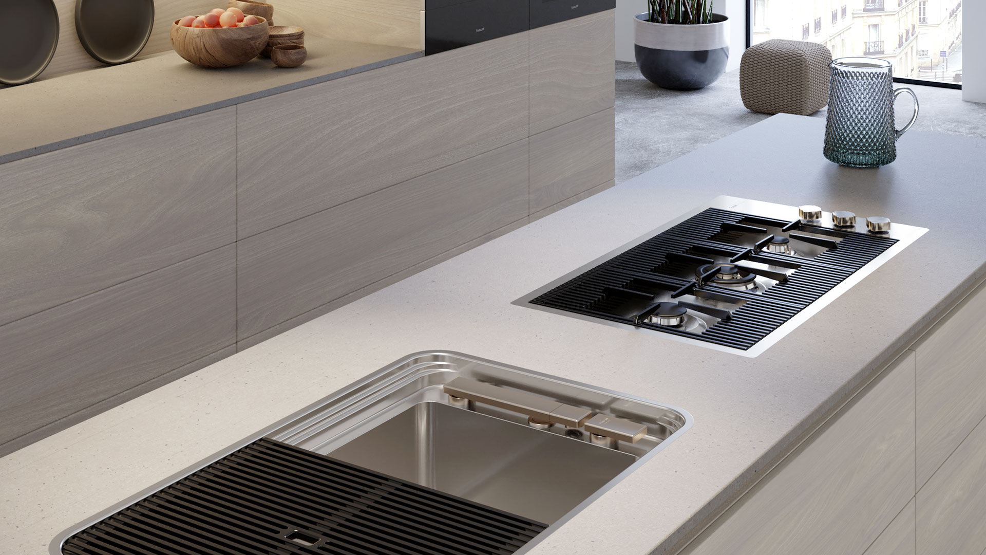 über das Becken geschoben werden. Wenn die Küche ruht, ist alles perfekt in der Spüle versteckt, einschließlich der klappbaren Mischbatterie Eclipse, die dank der beiden schwarzen Gitter eine aufgeräumte und elegante Lösung darstellt.