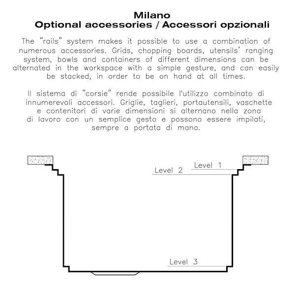 Foster Milano hat ausgeklügeltes Design mit einem System mit drei Aussparungen, in denen das Zubehör auf verschiedenen Ebenen untergebracht ist. In der ersten gleiten die innovativen Gitter Black, eine große und praktische Fläche zum Spülen, Abtropfen, Arbeiten. Die zweite Aussparung ist zur...r Aufnahme und zum Verschieben einer kompletten Kombination von Zubehörteilen ausgelegt, die jeden Vorgang sicher und praktisch machen: Spülen, Abtropfen, Schneiden, Reiben... immer innerhalb des Spülbeckens. Die dritte Aussparung befindet sich am Beckenboden. Darauf befinden sich die Gitter Black zum Spülen von Lebensmitteln, ohne dass diese mit dem möglicherweise verschmutzten Boden in Berührung kommen, oder zum Abstellen von Töpfen ohne Kratzer. Die neuen Gitter Black zeichnen sich durch Ästhetik und Funktionalität aus. Sie sind nicht nur hygienisch, leicht, robust und einfach zu reinigen, sondern auch 100 % ökologisch, eine Entscheidung zum Schutz der Natur und unserer Umwelt.