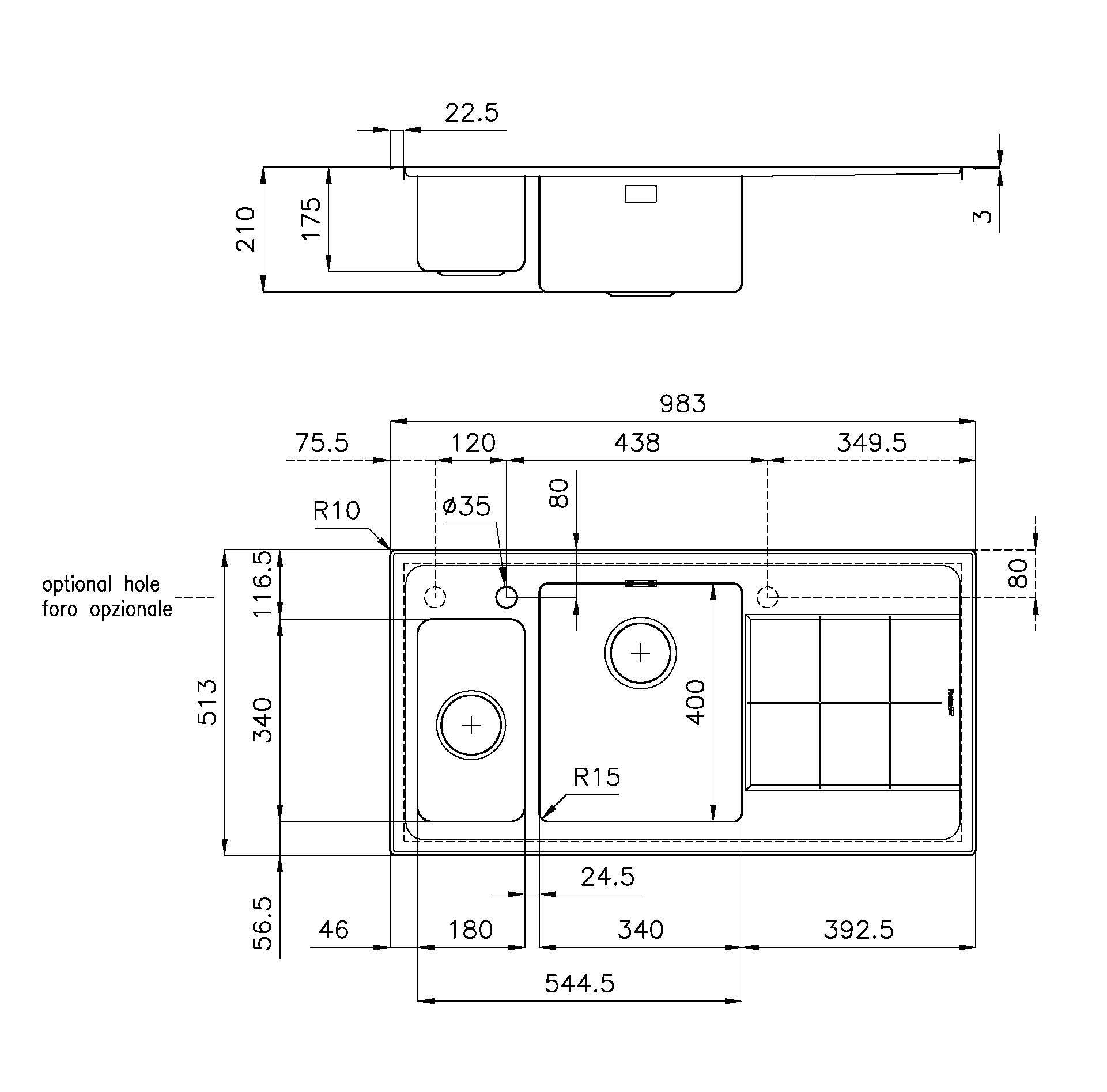 Die Spüle kann auf Wunsch bei der Bestellung mit zusätzlichen Bohrungen versehen werden, die für Doppellocharmaturen, ferngesteuerte Abflüsse oder den Einbau von Seifenspendern genutzt werden können. Die Positionen sind in den Zeichnungen mit gestrichelten Löchern markiert.