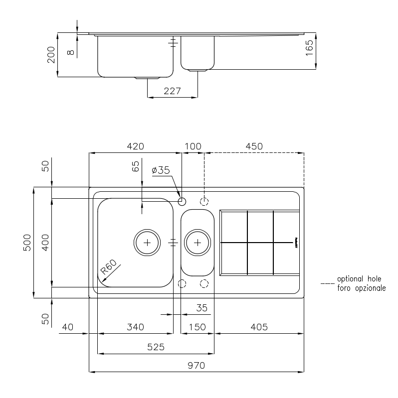 Die Spüle kann auf Wunsch bei der Bestellung mit zusätzlichen Bohrungen versehen werden, die für Doppellocharmaturen, ferngesteuerte Abflüsse oder den Einbau von Seifenspendern genutzt werden können. Die Positionen sind in den Zeichnungen mit gestrichelten Löchern markiert.