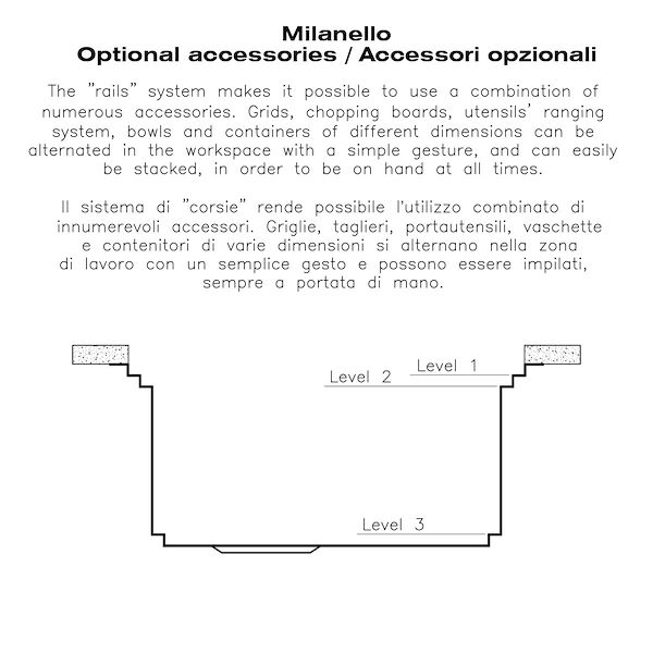 DREIFACHE AUSSPARUNG – SCHIEBE-ZUBEHÖR-SYSTEMFoster Milano hat ausgeklügeltes Design mit einem System mit drei Aussparungen, in denen das Zubehör auf verschiedenen Ebenen untergebracht ist. In der ersten gleiten die innovativen Gitter Black, eine große und praktische Fläche zum Spülen, Abtropfen, Arbeiten. Die zweite Aussparung ist zur...r Aufnahme und zum Verschieben einer kompletten Kombination von Zubehörteilen ausgelegt, die jeden Vorgang sicher und praktisch machen: Spülen, Abtropfen, Schneiden, Reiben... immer innerhalb des Spülbeckens.