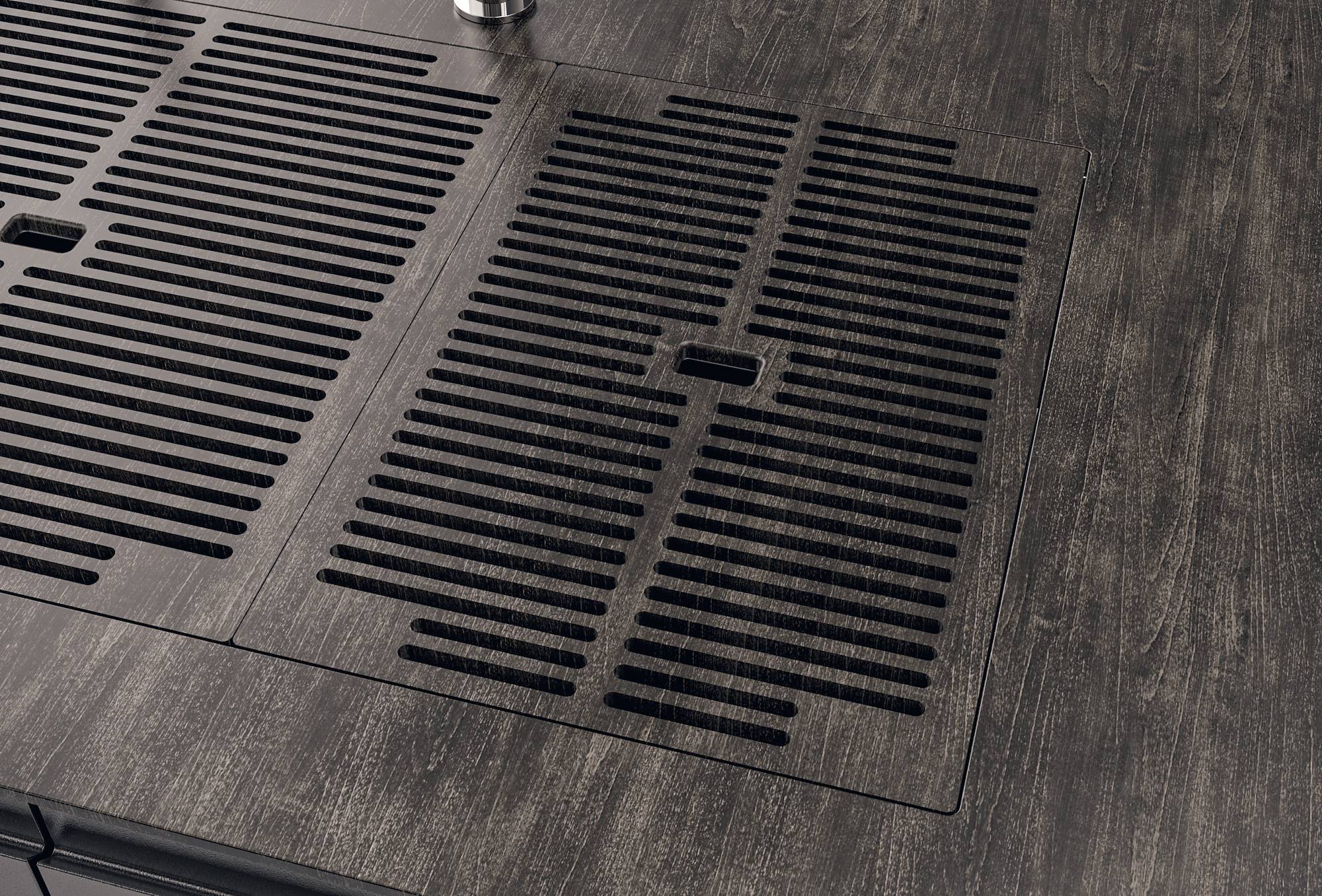 Der Überlauf ist ein allgegenwärtiges Sicherheitsmerkmal bei Foster-Spülbecken, das verhindert, dass das Wasser aus dem Becken überläuft, wenn man es einmal vergisst. Die Lösung des Randablaufs verbessert die Ästhetik dank ihrer quadratischen und essentiellen Form.
