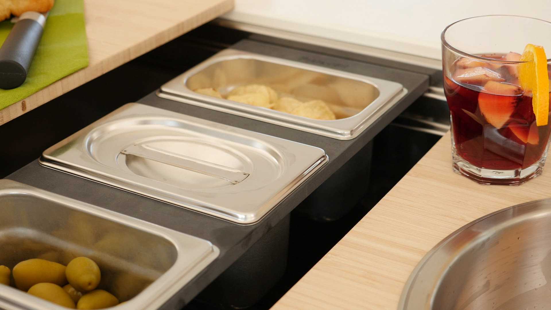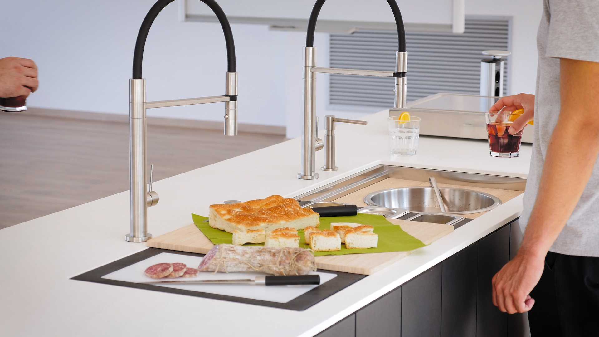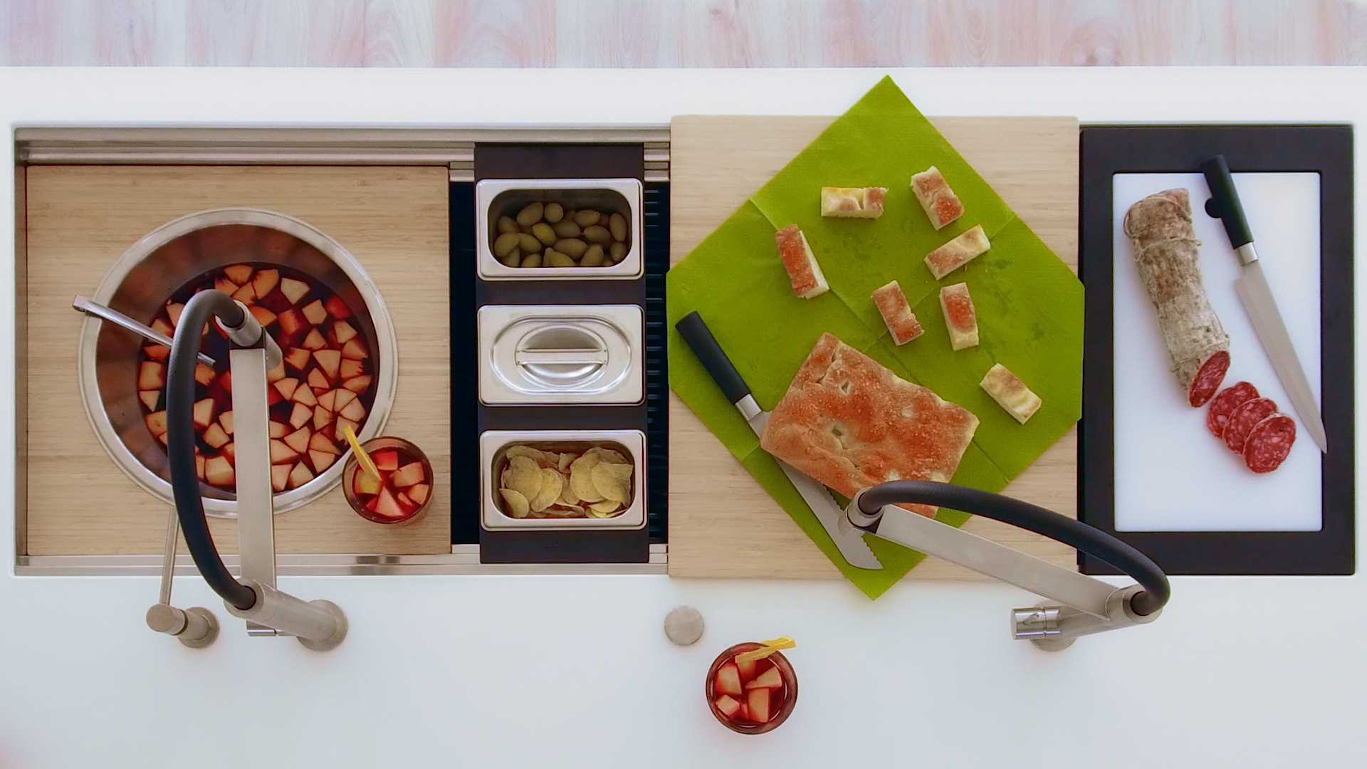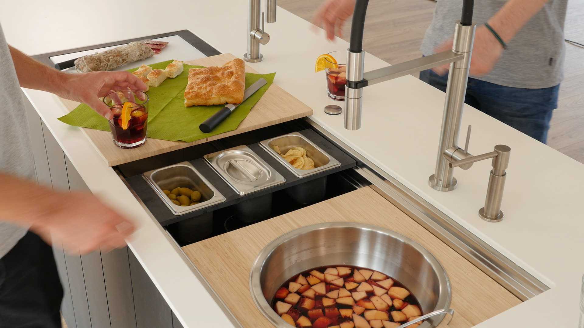 Das Funktionszentrum HappyHour, ein Objekt, das die Definition der Spüle zu neuen Horizonten führt. Mit seinem umfangreichen Zubehör ist sie der wahre Star bei Ihren Aperitifs und Buffets und gleichzeitig ein praktischer und kompletter Küchenarbeitsplatz, der im mehrfach ausgestatteten Spülbereich verschwinden und wieder auftauchen kann.